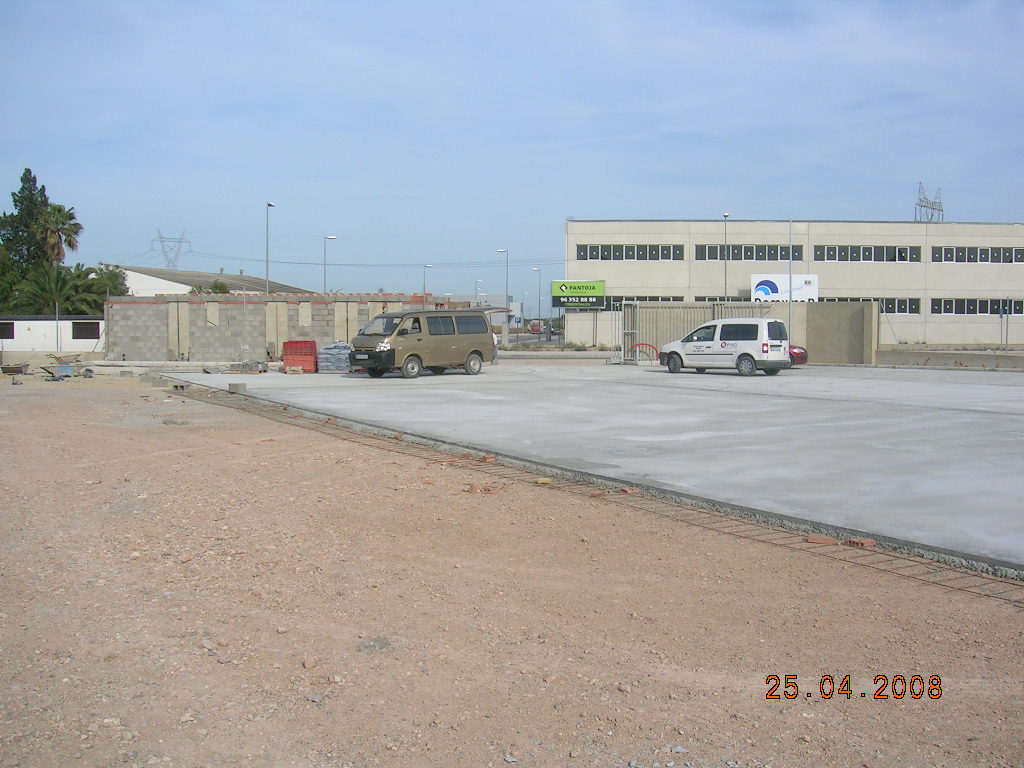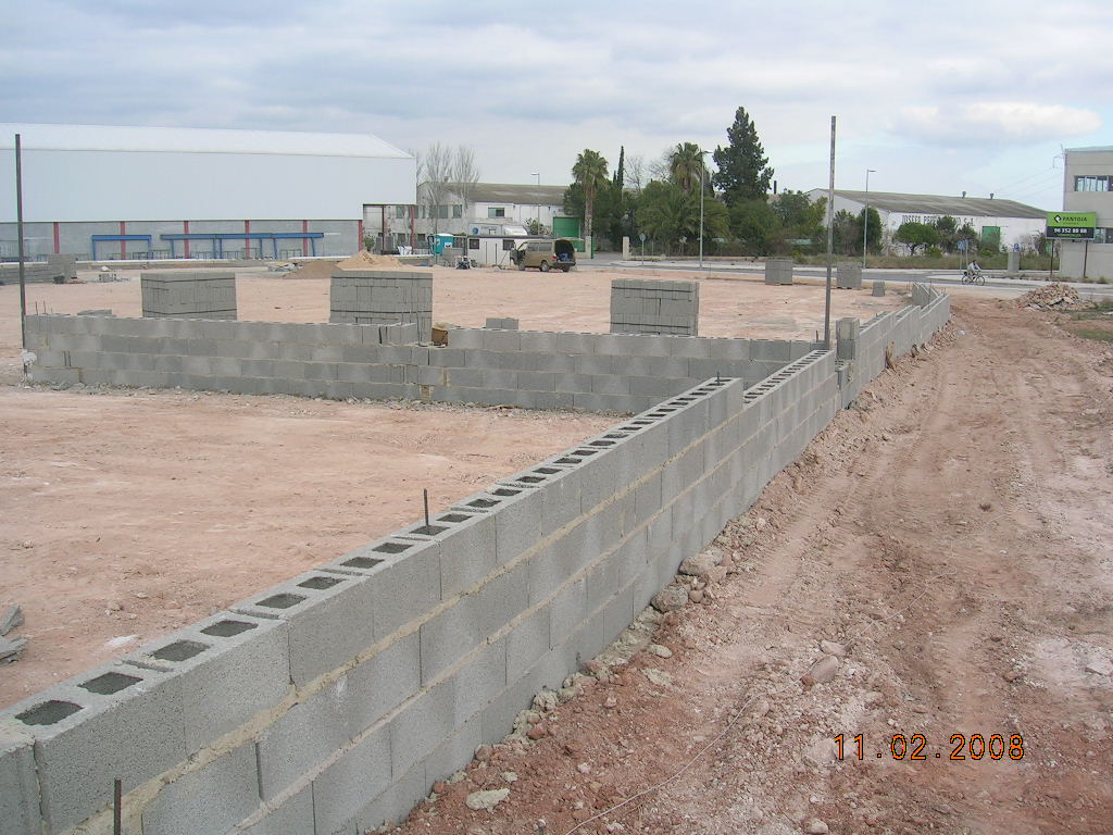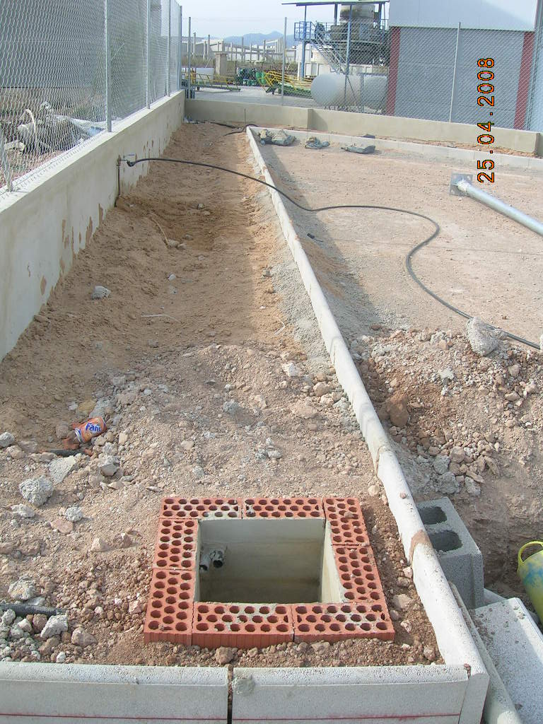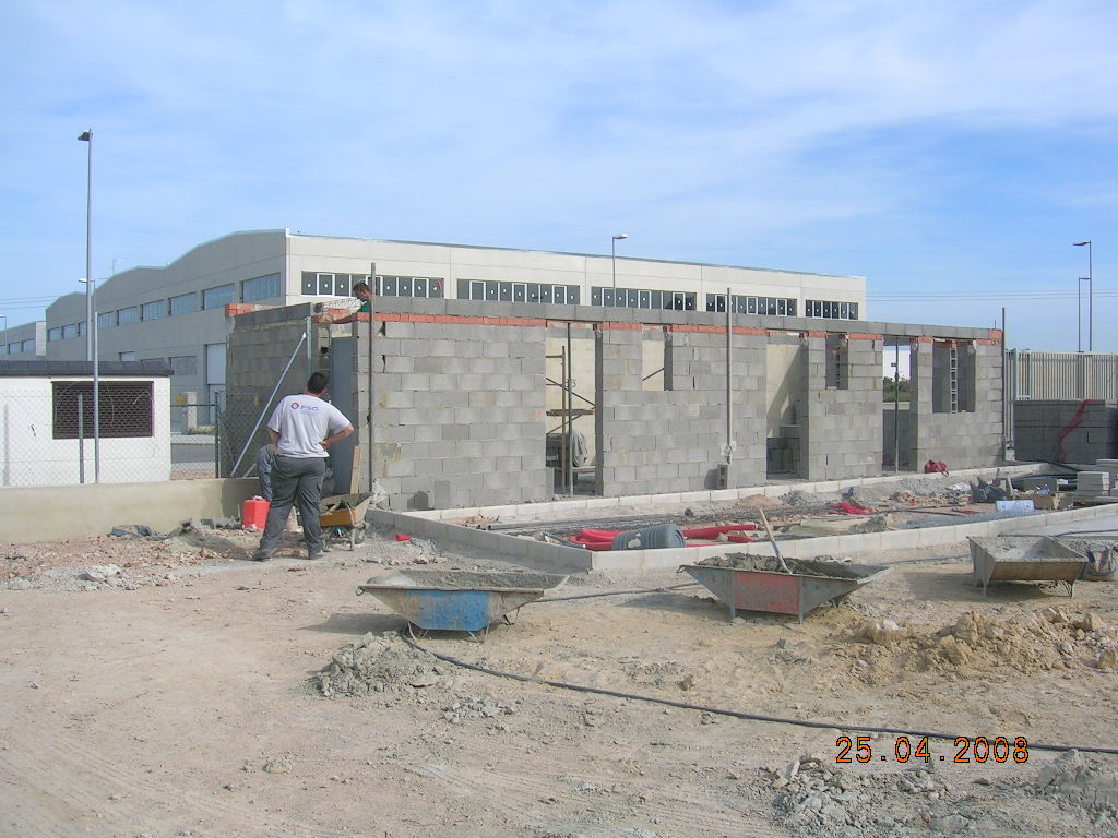 Realización de trabajos de fontanería y saneamiento, así como la obra civil necesaria consistente en: desbroce y acondicionamiento de la plataforma, muro perimetral con valla de simple torsión, trabajos de urbanización y edificación de las oficinas, vestuarios y almacén.